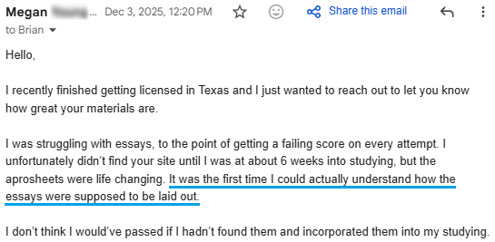 “I was struggling with essays to the point of getting a failing score on every attempt. I didn’t find your site until I was 6 weeks into studying, but Approsheets were life changing. It was the first time I could actually understand how the essays were supposed to be laid out.”