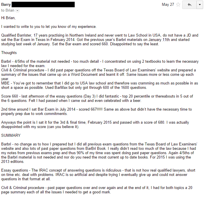 BARRY: Third timer, a foreign lawyer from Ireland. Focused on the MBE, his weak area, to pass the Texas Bar Exam.