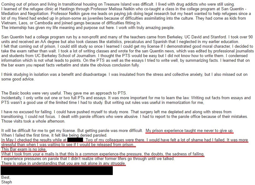 STEPH: Was in prison for 32 years, had to learn how to use a smartphone and the Internet, and closed a 150-point gap to pass the California Bar Exam as a second timer. You have no excuse.